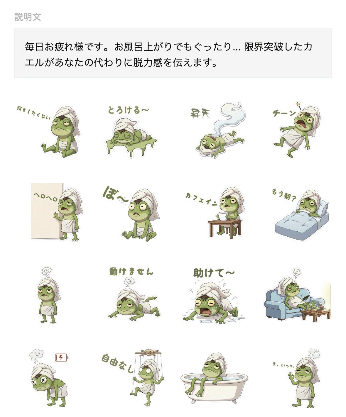 • 内容: 毎日お疲れ様です。お風呂上がりでもぐったり…限界突破したカエルがあなたの代わりに脱力感を伝えます。
