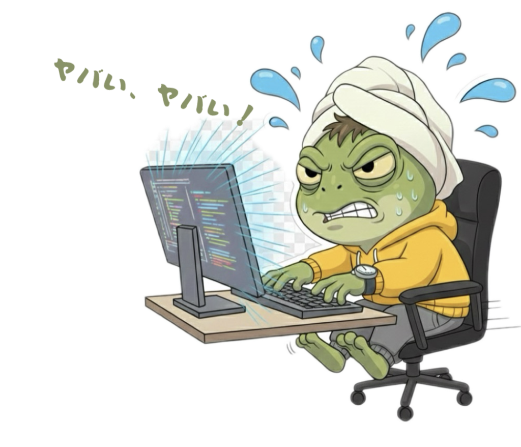 • バグと戦っているのか、画面が発光している**「ヤバい、ヤバい!」**