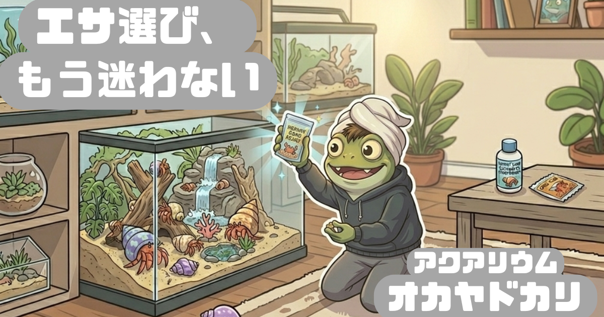 これからヤドカリの飼育を始める方や、エサ選びに迷っている方は、「まずは主食(専用フード)と、補助剤(カルシウム)をセットでそろえる」のが圧倒的におすすめです。 ぜひこの基本セットから始めて、たまに果物やポップコーンでヤドカリとの距離を縮めながら、楽しい飼育ライフを送ってくださいね!